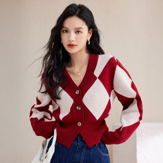 特價菱格羊毛混紡開衫針織衣