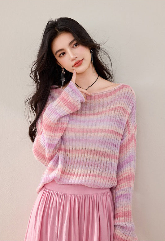 特價粉色彩條一字領針織衫