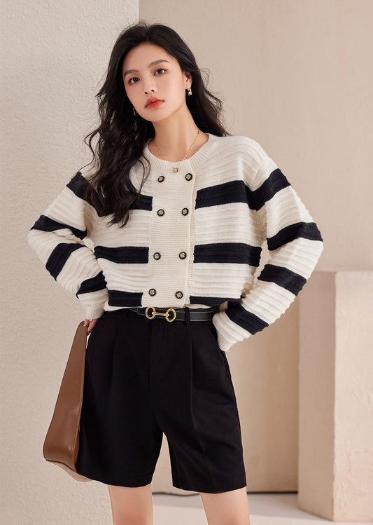 特價圓領撞色條紋雙排扣針織衫