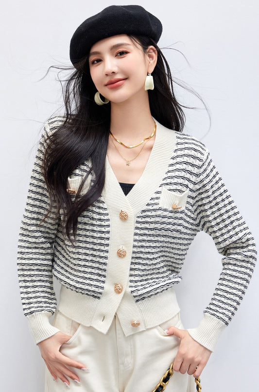 特價小香風金扣條紋V領針織衣