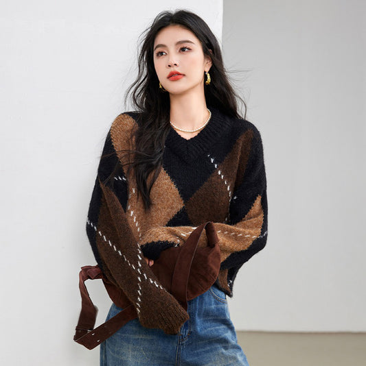 特價圓領復古菱格針織毛衣