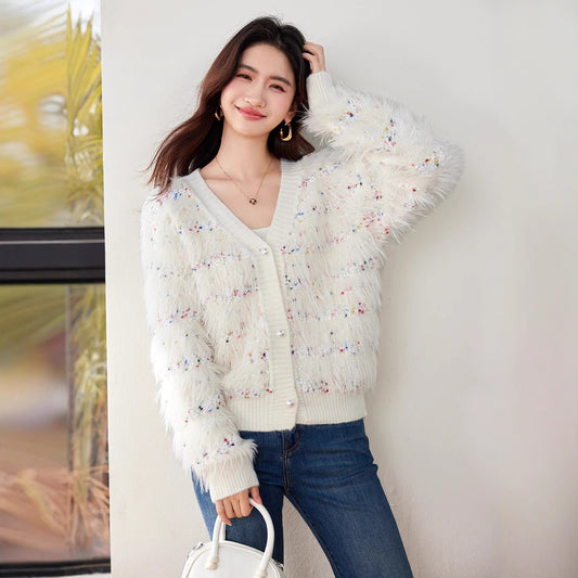 特價V領毛絨絨鈕扣開衫毛衣