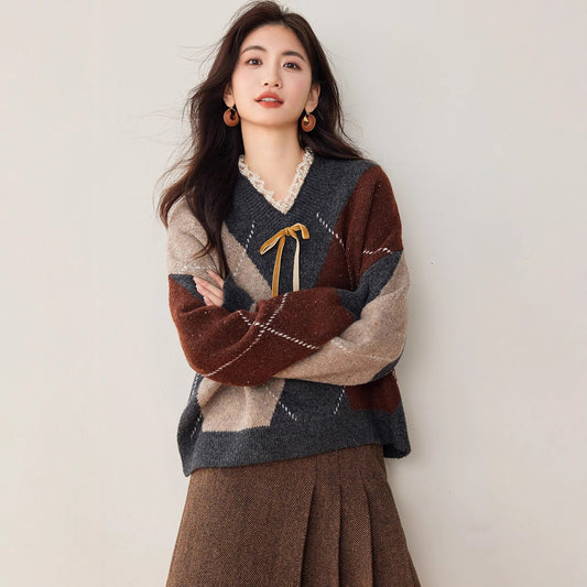特價蕾絲花邊菱格撞色毛衣