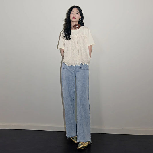 特價🔥圓領拼接花朵蕾絲T恤