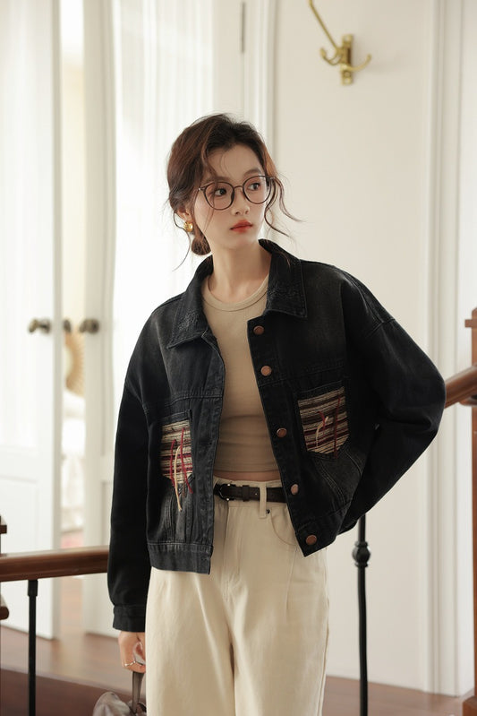 特價刺繡拼接口袋牛仔外套